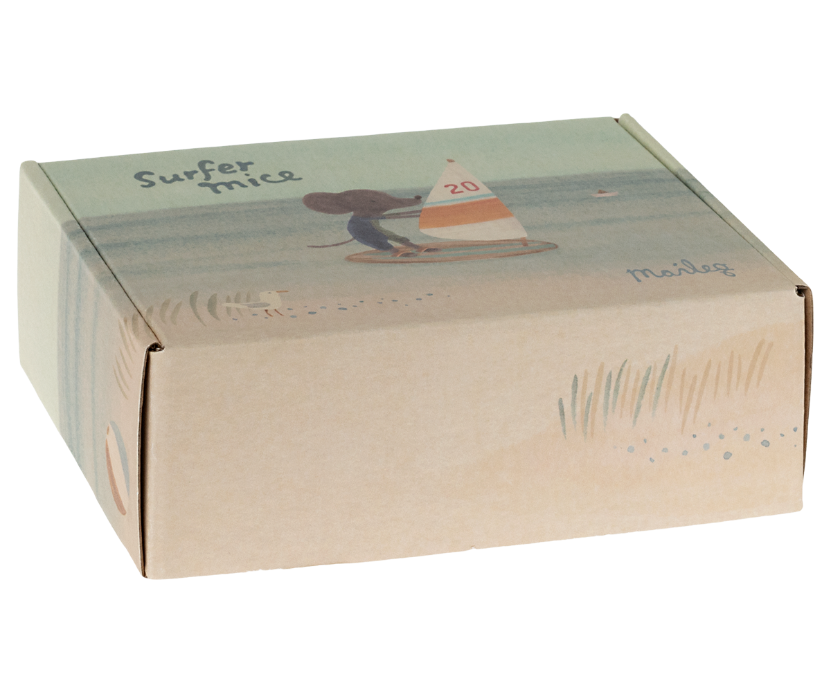 Capture the joy of summer with this adorable little brother mouse, ready for his next big wave. At 4 inches tall, he sports a charming dusty blue and forest green wetsuit, paired with a striped surfboard that features handy elastic straps for his feet. Magnetic hands allow him to steer his sail with ease during endless beach adventures. This delightful Maileg companion brings imaginative play to life with his detailed design and nautical flair.