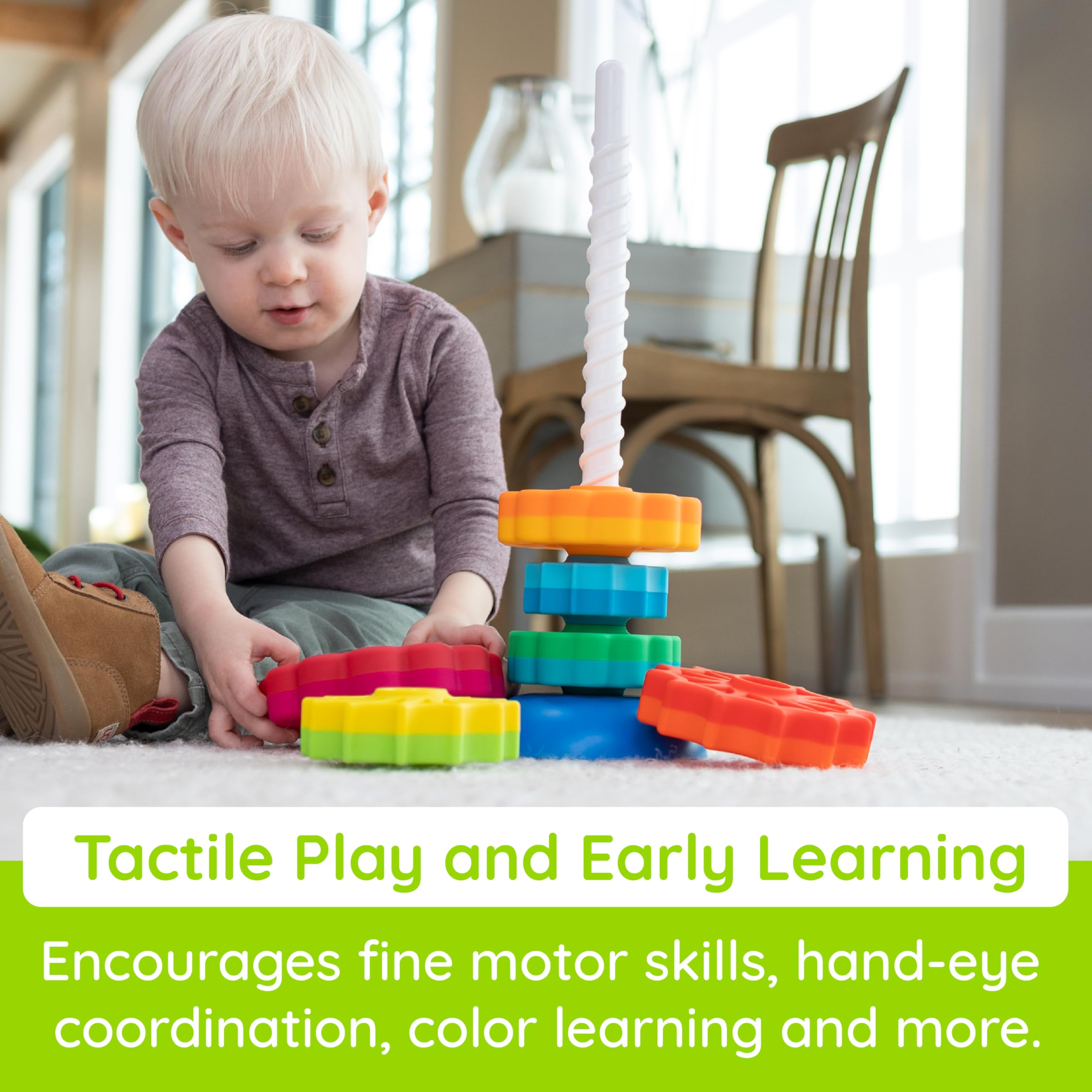 - SUPPORTS SORTING AND COUNTING SKILLS: Toddlers practice sorting by color, shape, and size while stacking and spinning, reinforcing early counting skills in a playful manner